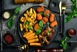 Beer snack plate: chicken nuggets, chicken wings, cheese and fries. On a dark background, close-up.