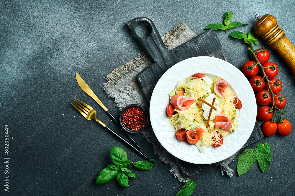 Caesar salad with salmon. Fresh salad in a plate. Top view. Photo for the menu.