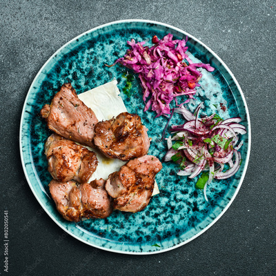 Grilled turkey meat kebabs. On a plate, served with fresh vegetables. Top view.