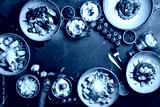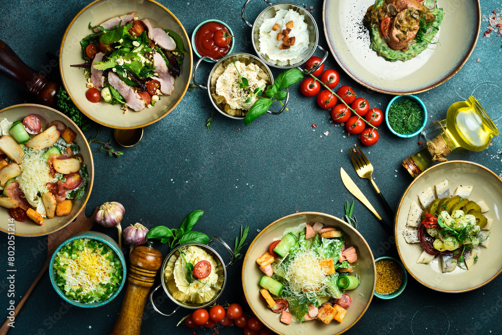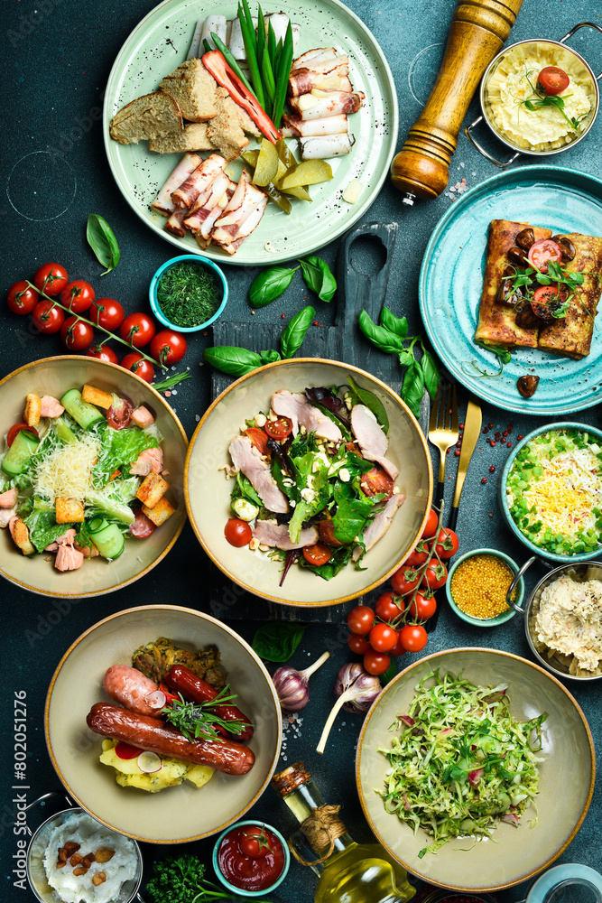 table with food, A set of food and dishes in plates. View from above. Food banner. On a dark stone background. free space for text.