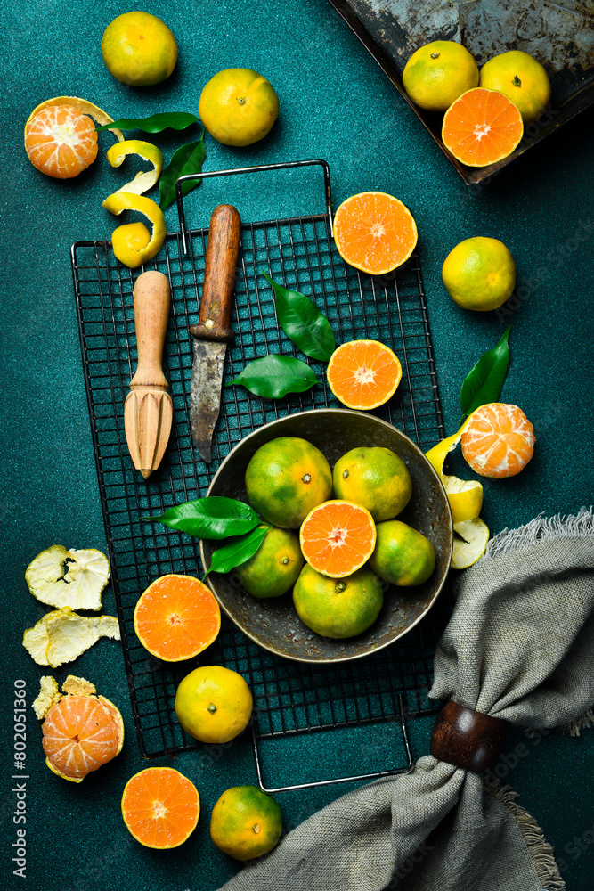 A bowl of juicy orange tangerines. Citrus fruits are rich in vitamin C. Autumn fruits.
