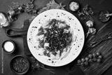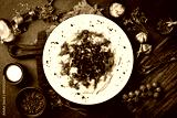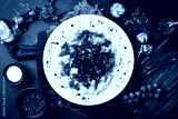 Dumplings with cracklings in a plate. Free space for text. Close up.