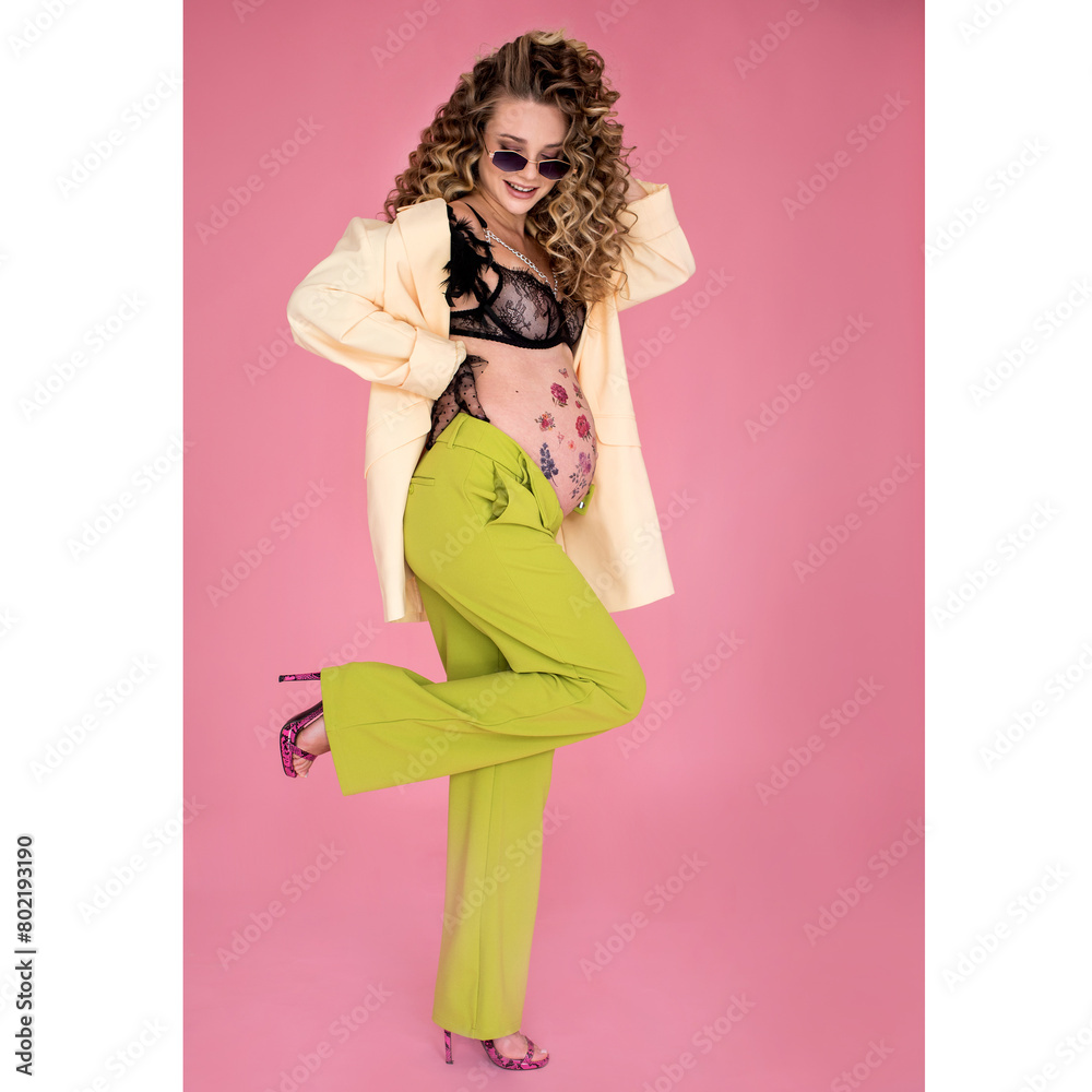 pregnant woman with curly hair , belly with floral pattern, wearing glasses, bright clothes and lingerie in pin up style on pink background
