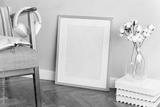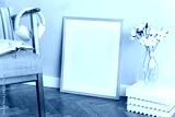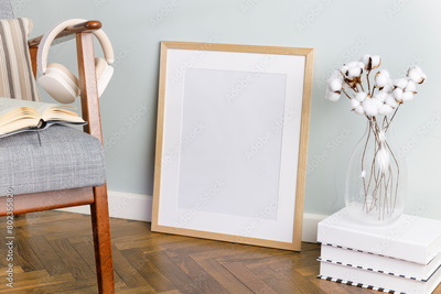 Home interior blank picture frame mockup, room in light pastel colors, Scandinavian style interior background
