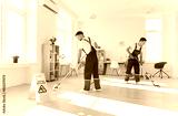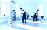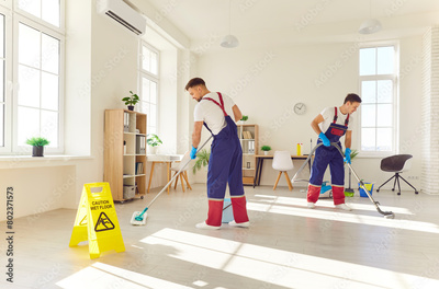 Efficient cleaning service in action. Two professional cleaners in uniform diligently clean floor in modern apartment. Male employees of cleaning company use signs with inscription caution wet floor.
