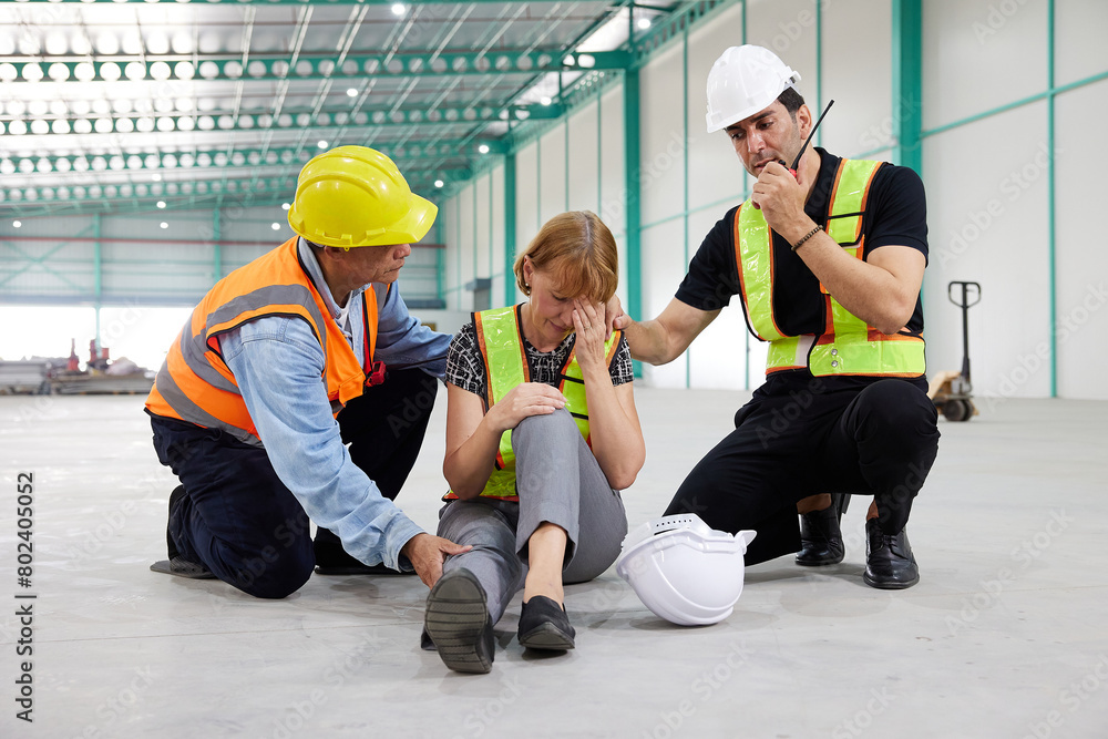 senior worker fall down on the floor with hurting knee and coworker helping her in the factory