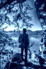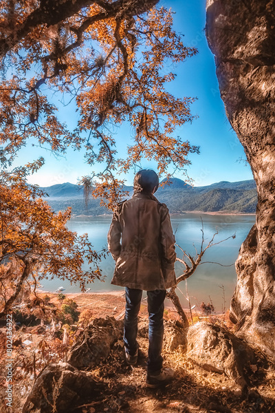 Man facing a cliff, with the lake in Bravo Valley, State of Mexico