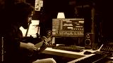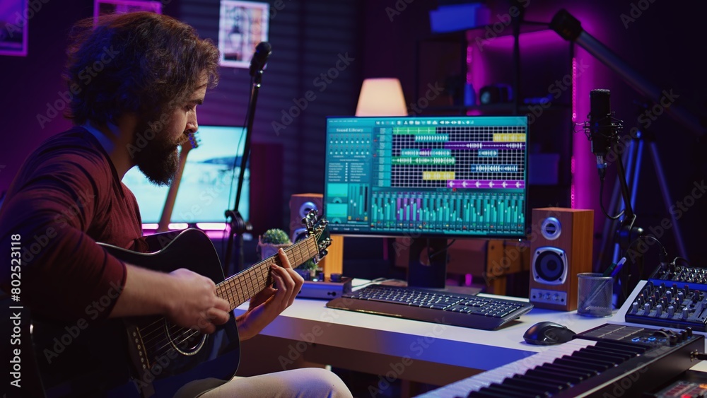 Musical performer recording guitar sounds for a new track in home studio, soundboard controls and daw software on computer. Young musician playing acoustic instrument, music industry. Camera B.