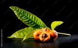 Loquat fruit or Japanese medlars, Nispero, Eriobotrya japonica with leaves fresh ripe bio vegetarian food, medlar berries. Close up. On black table background