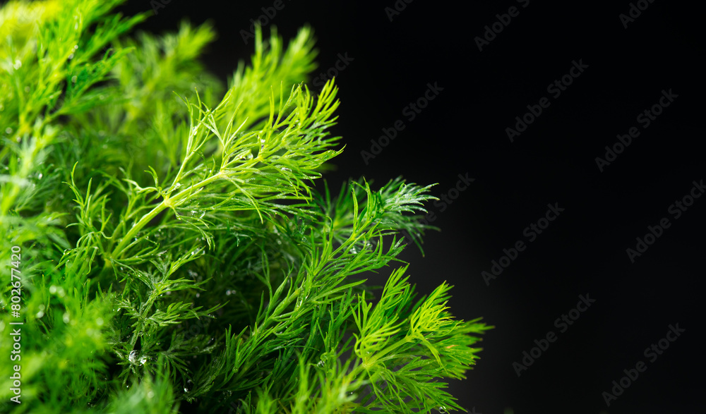 Dill aromatic fresh herbs. Bunch of fresh green dill close up, isolated on black background, condiments. Vegetarian food, organic. Anethum graveolens macro shot, border design