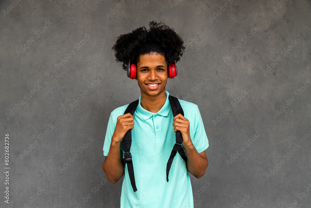 Happy teen African American boy with afro hairstyle looking at camera wearing headphones and backpack.