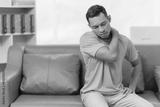 Asian man with back pain Massaging sore muscles while sitting on the sofa, elderly people and health problems concept.