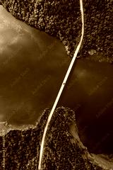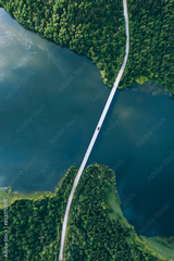 Aerial view of bridge asphalt road with cars and blue water lake and green woods