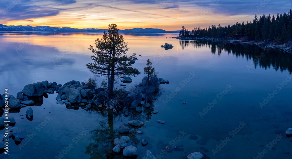 Lone tree on rocks at sunset on a calm Lake Tahoe. In the background os a forest and mountains covered in snow. Zephyr Cove, Nevada, United States of America.