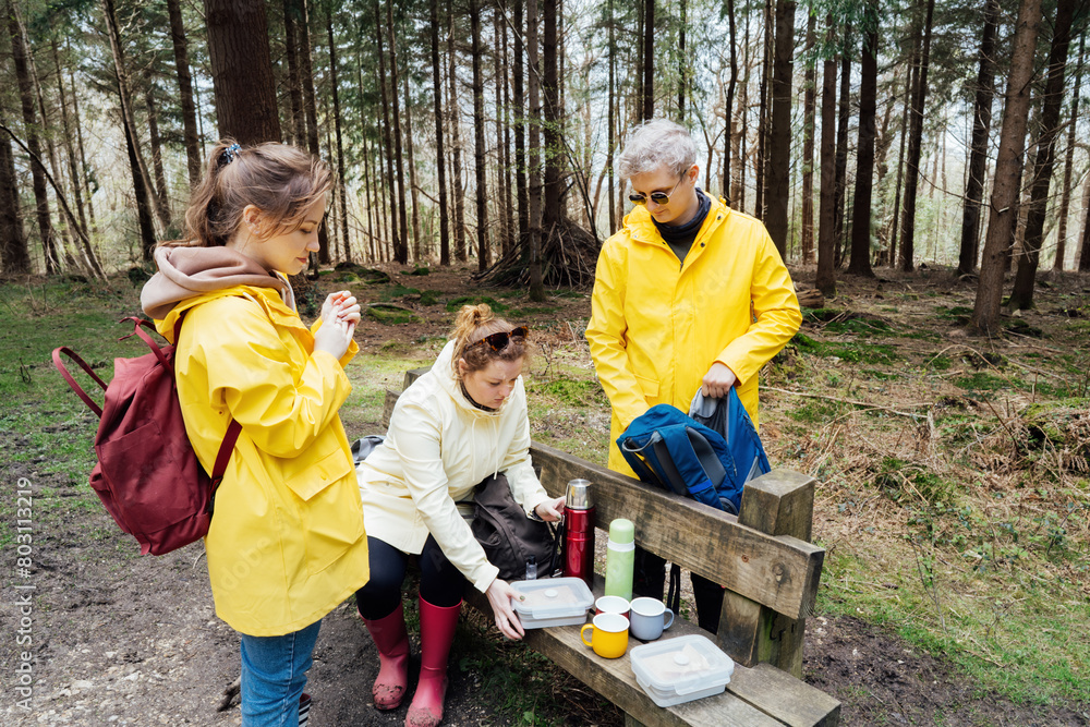 Halt for snack during hiking. Company hikers enjoying picnic on the bench, drinking hot tea, eating sandwiches in forest. Friends relaxing and having snack picnic on nature background. Backpacker trip