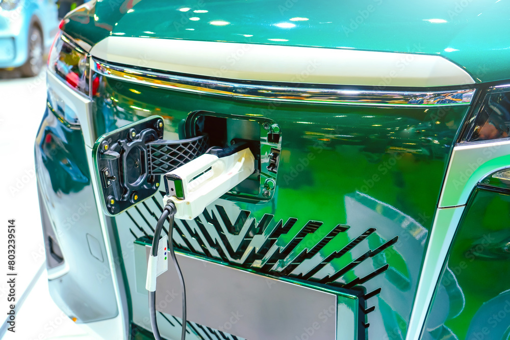 EV Car Electric vehicle at charging station with the power cable supply plugged front part instead of radiator grille hood in energy power effect. Eco-friendly sustainable energy concept.