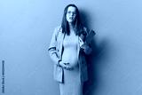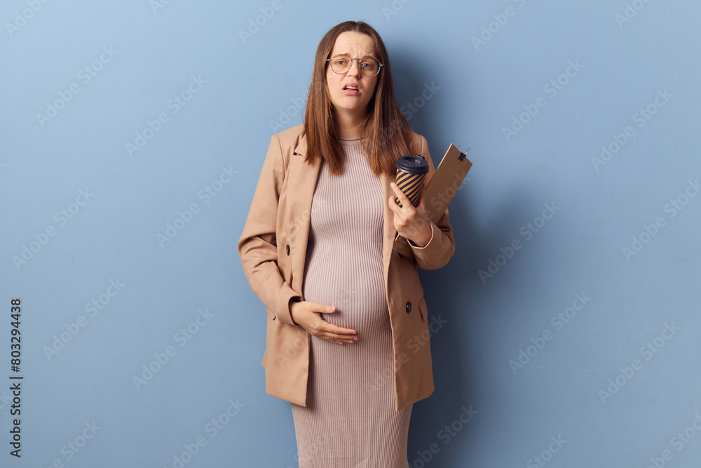 Sad pregnant woman in beautiful dress and jacket posing isolated over blue background holding documents and disposable cup of coffee feeling unwell during work