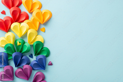 An arrangement of colorful paper hearts in rainbow colors spread on a light blue background symbolizing love and diversity during pride month
