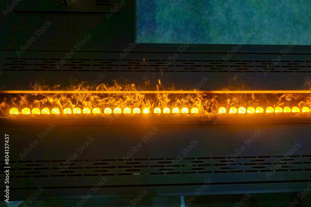 Long horizontal fireplace with flame and round induction heating elements.
