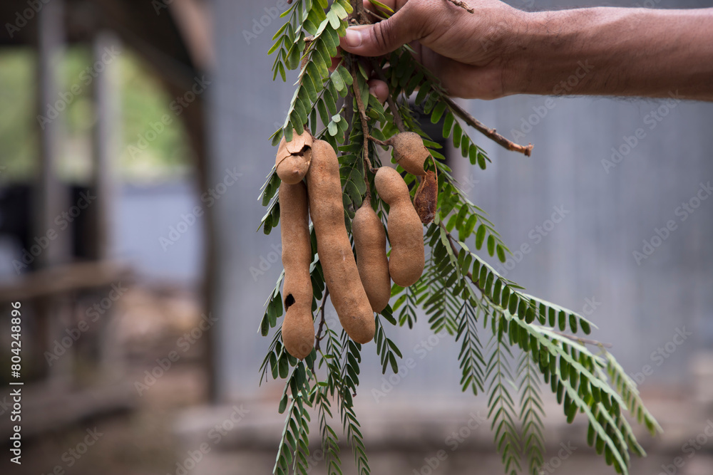 Hand holding some Tamarind Fruits, green leaves with Blurry Background. Selective Focus