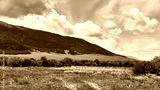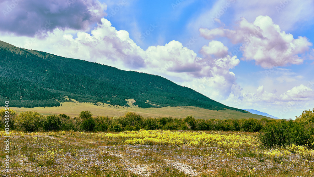 panoramic view of the mountains covered with coniferous forest and cumulus clouds above them