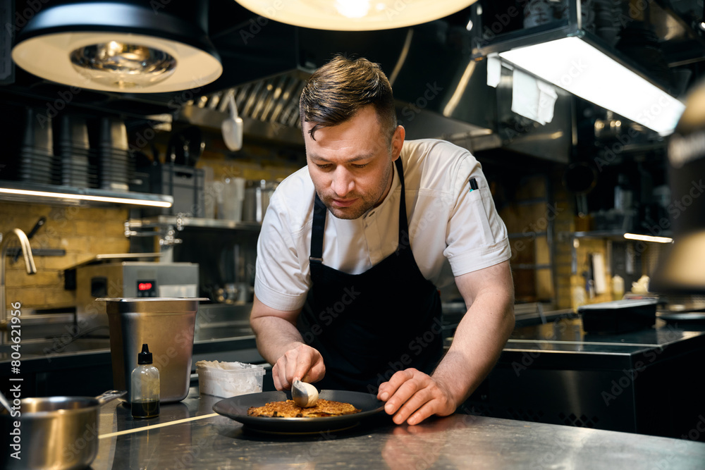 male chef adding cream in spoon to frying waffle on plate at table in restaurant