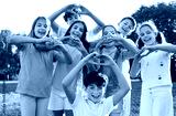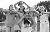 Portrait of a happy smiling children looking at the camera making heart shape gesture standing in the summer park outdoors. Thankful kids doing love sign by hands in nature in sunlight.
