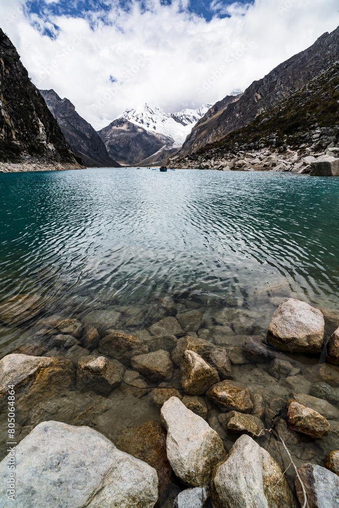panormaic view of laguna paron in the snow-covered andes in the Huascarán national park in peru