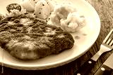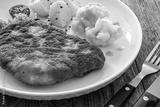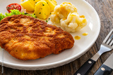 Crispy breaded fried pork chop, boiled potatoes and cooked cauliflower on wooden table