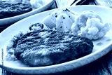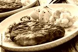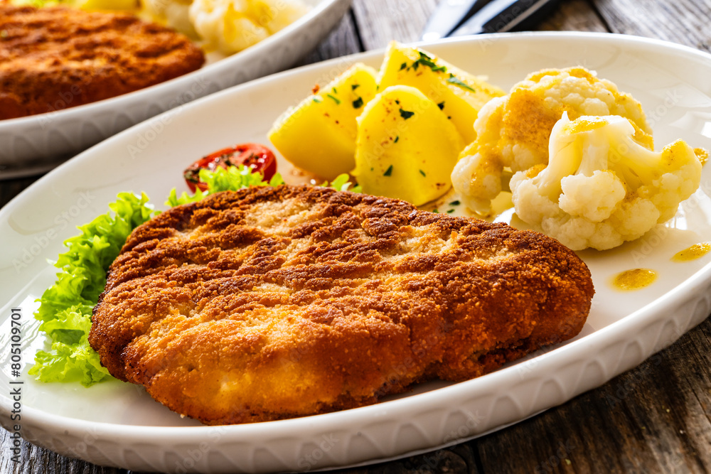 Crispy breaded fried pork chop, boiled potatoes and cooked cauliflower on wooden table