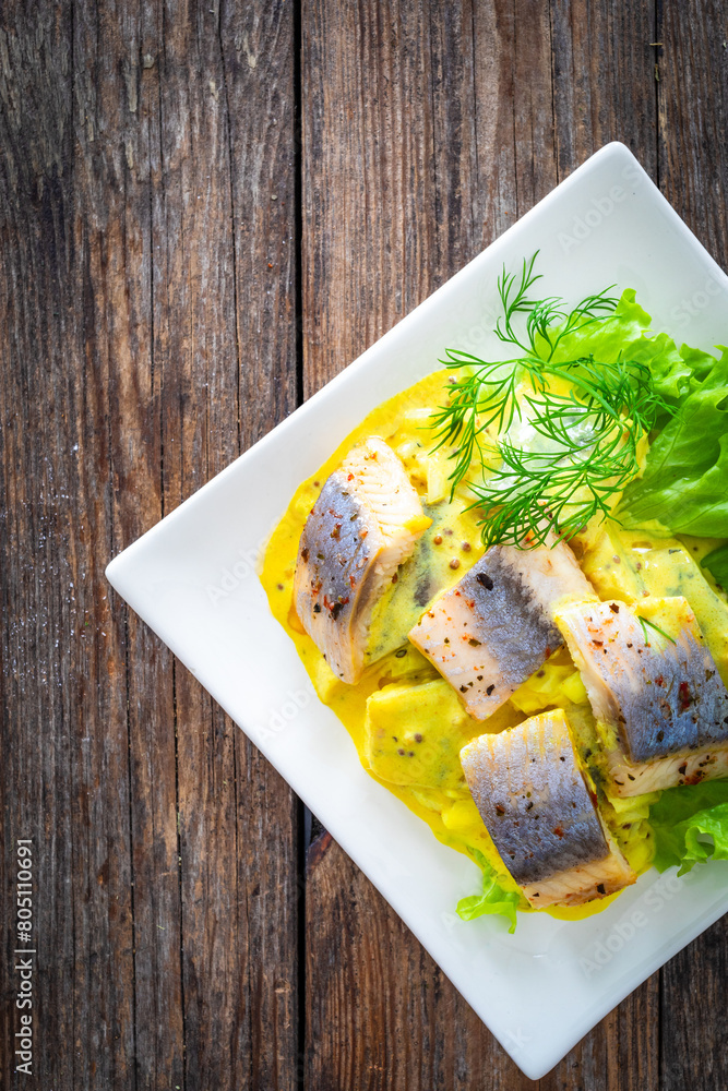 Marinated herring fillets in mustard sauce with dill and lettuce on wooden table