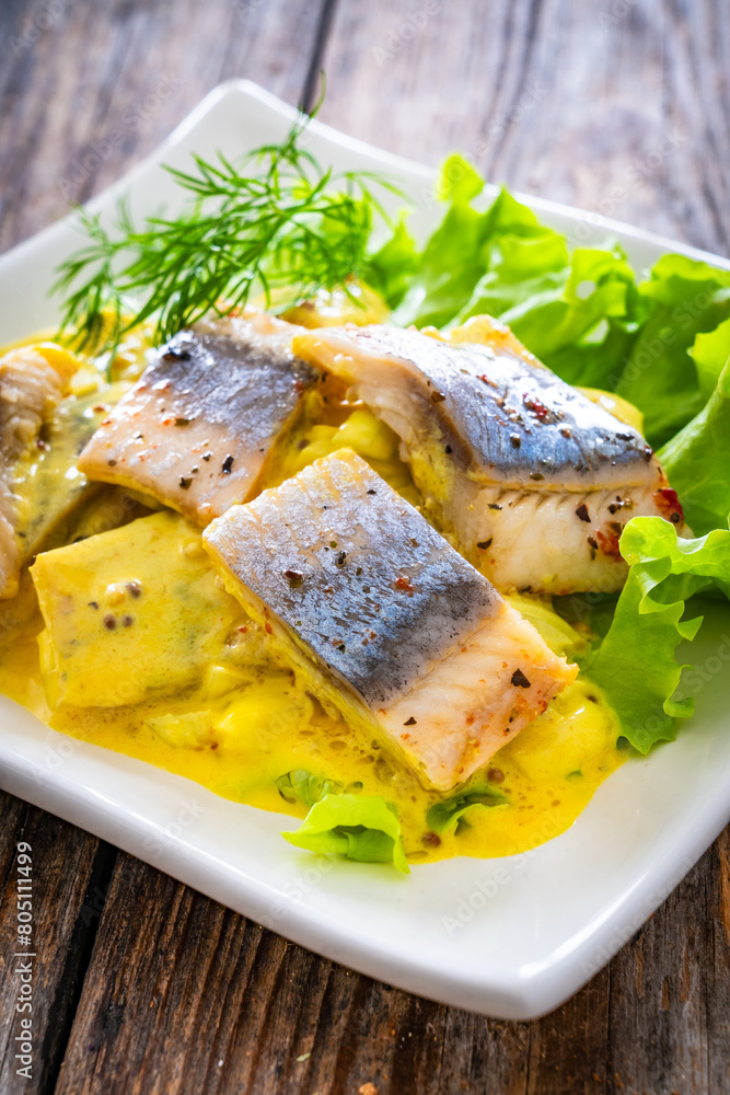 Marinated herring fillets in mustard sauce with dill and lettuce on wooden table