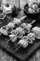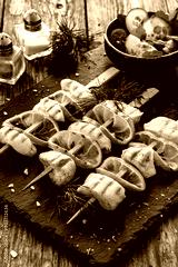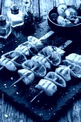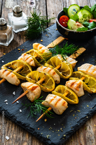 Poultry meat skewers - grilled meat with lime slices on wooden background