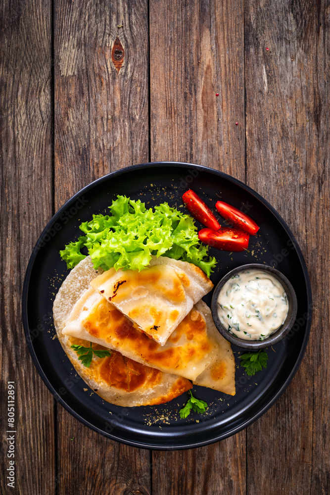 Cheburek - deep-fried turnovers filled with ground meat and vegetables on wooden table