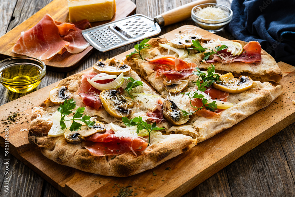 Roman Pinsa with mozzarella cheese, ripening ham and mushrooms on wooden table
