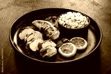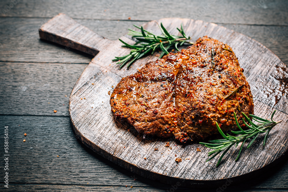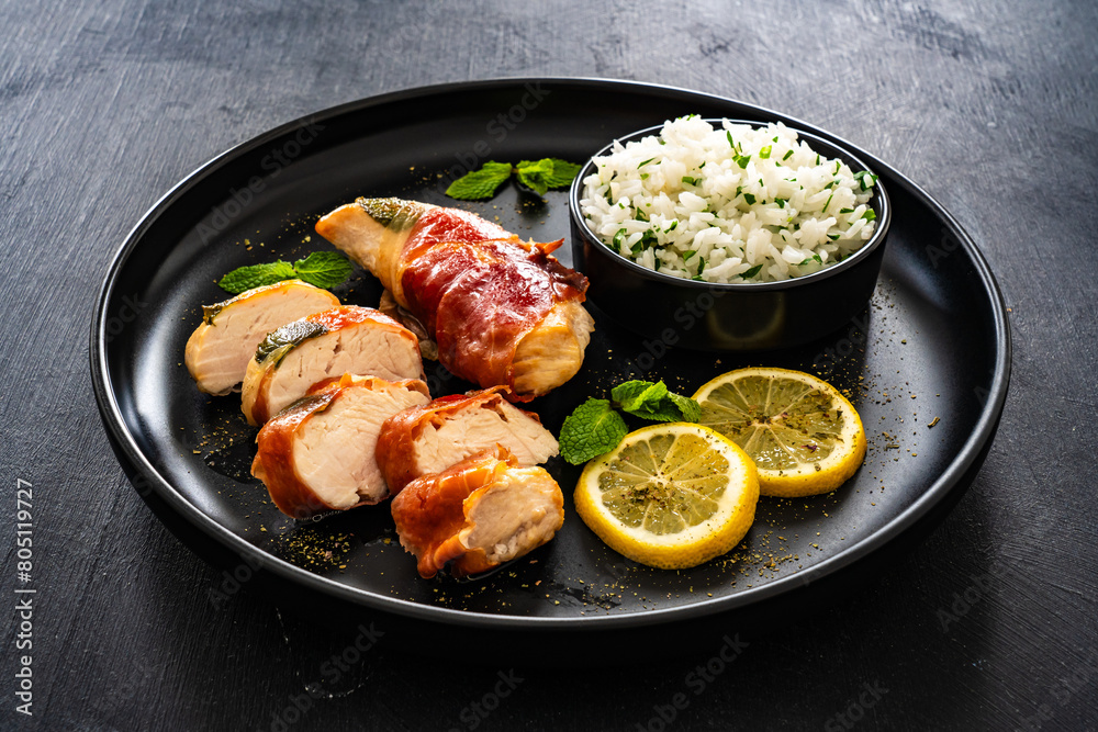Chicken Saltimbocca - pan-fried chicken cutlets wrapped in Italian prosciutto slices on black wooden table