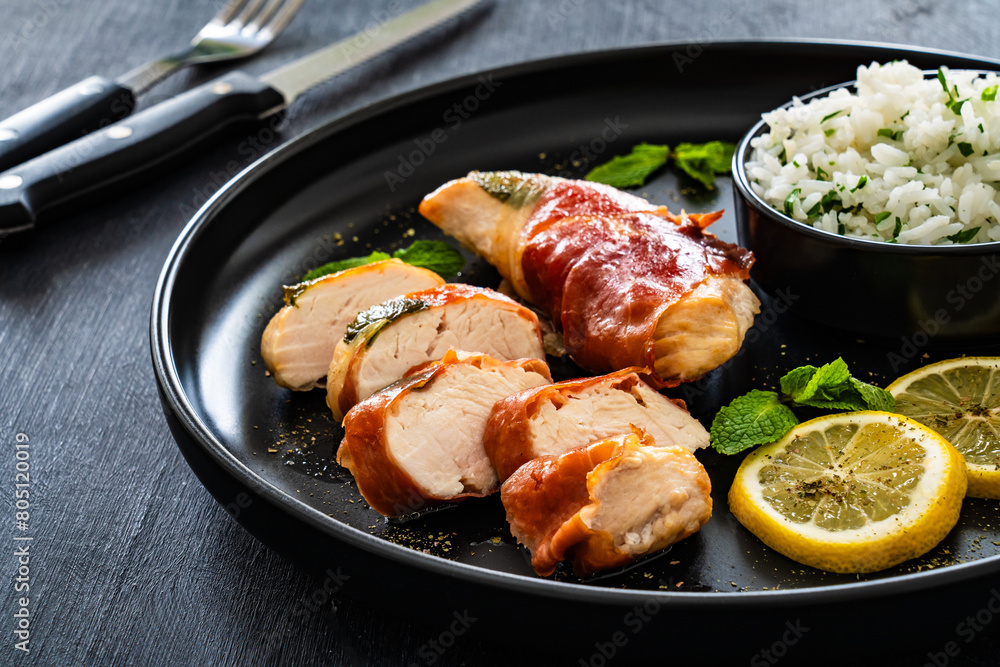 Chicken Saltimbocca - pan-fried chicken cutlets wrapped in Italian prosciutto slices on black wooden table