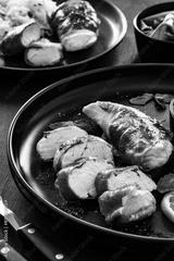 Chicken Saltimbocca - pan-fried chicken cutlets wrapped in Italian prosciutto slices on black wooden table