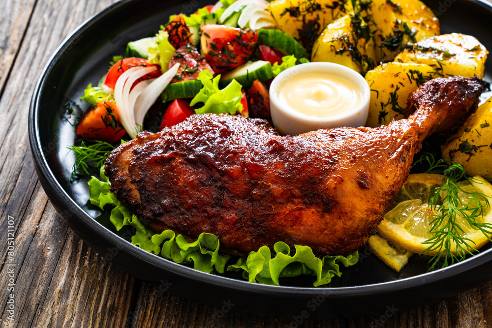 Oven roasted chicken thigh with boiled potatoes and fresh vegetables on wooden table