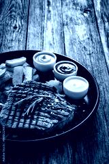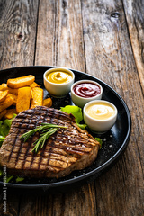 Grilled beef sirloin steak with French fries on wooden table