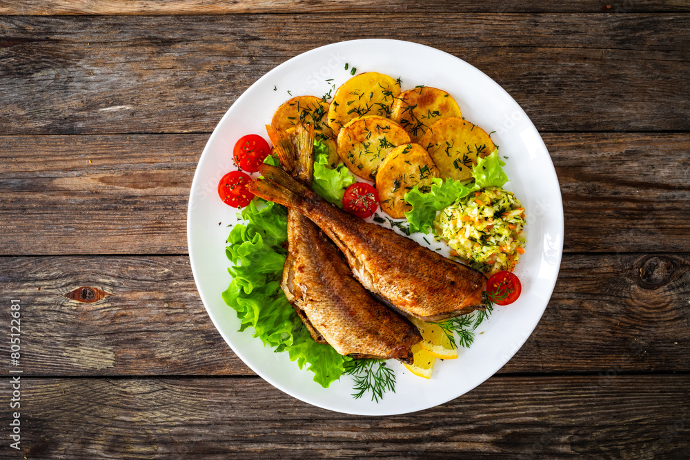 Fried sea bass with fried potatoes and fresh cabbage salad on wooden table