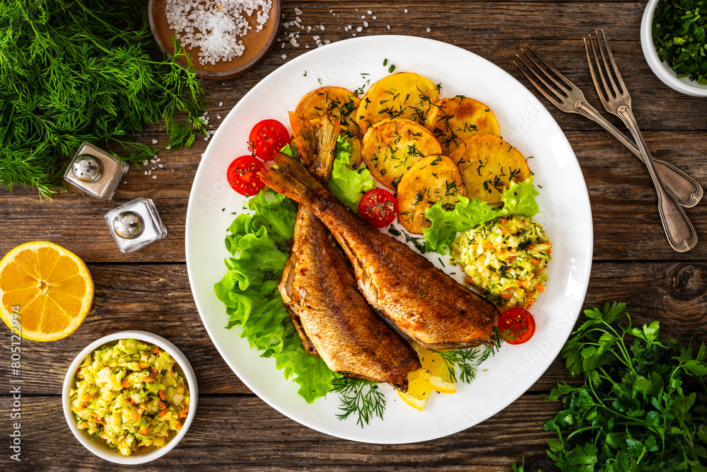 Fried sea bass with fried potatoes and fresh cabbage salad on wooden table