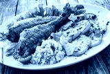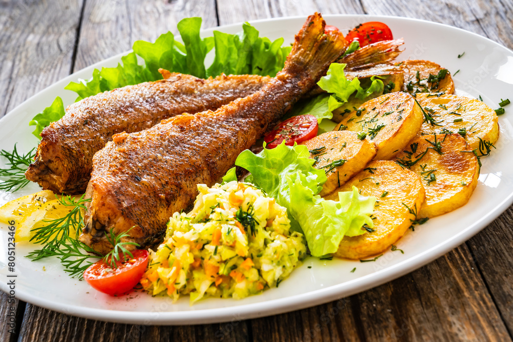 Fried sea bass with fried potatoes and fresh cabbage salad on wooden table