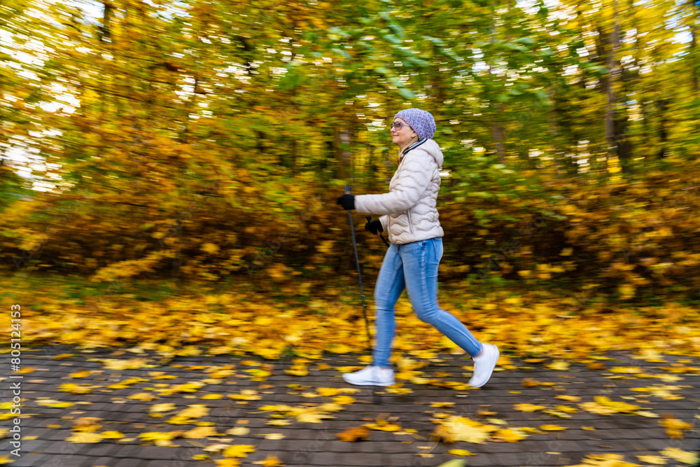 Motion Blur. Mid-adult woman blurred silhouette exercising Nordic walking in city park