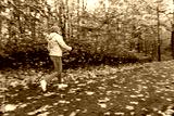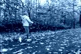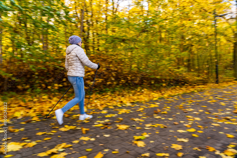Motion Blur. Mid-adult woman blurred silhouette exercising Nordic walking in city park