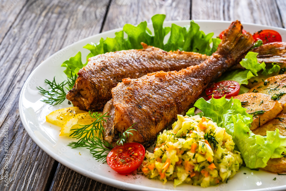 Fried sea bass with fried potatoes and fresh cabbage salad on wooden table