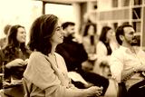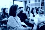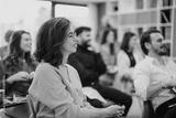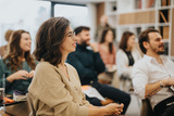 Smiling woman participating in a professional workshop with colleagues in a modern office setting, conveying engagement and teamwork.