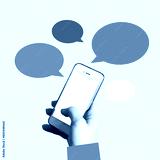 Contemporary art collage in magazine modern style. Woman hand with blank screen and bubble for text. Online communacation or work, social media, network, texting, business