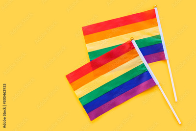 LGBT rainbow flag flat lay on yellow color background. gay marriage, human rights, june parade, lgbtq proud history month concept, coming out day. top view, place for text or logo