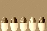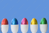 Row or line of colorful easter chocolate eggs in cups with blue background